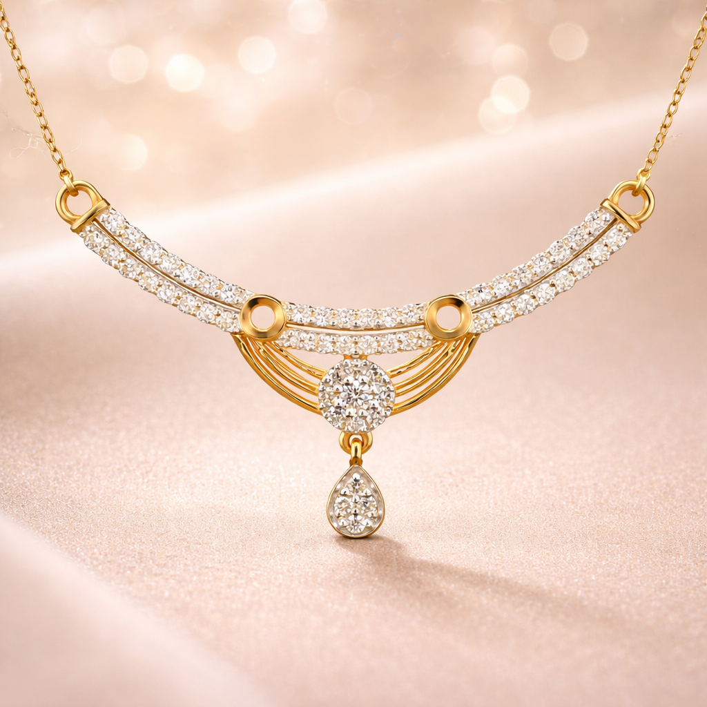 Crafted in high-quality gold, the pendant showcases delicate flowing lines that symbolize beauty, movement, and femininity. The diamond-studded centerpiece enhances its luxurious appeal, making it ideal for both everyday elegance and special occasions.
