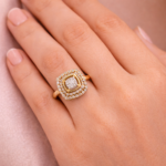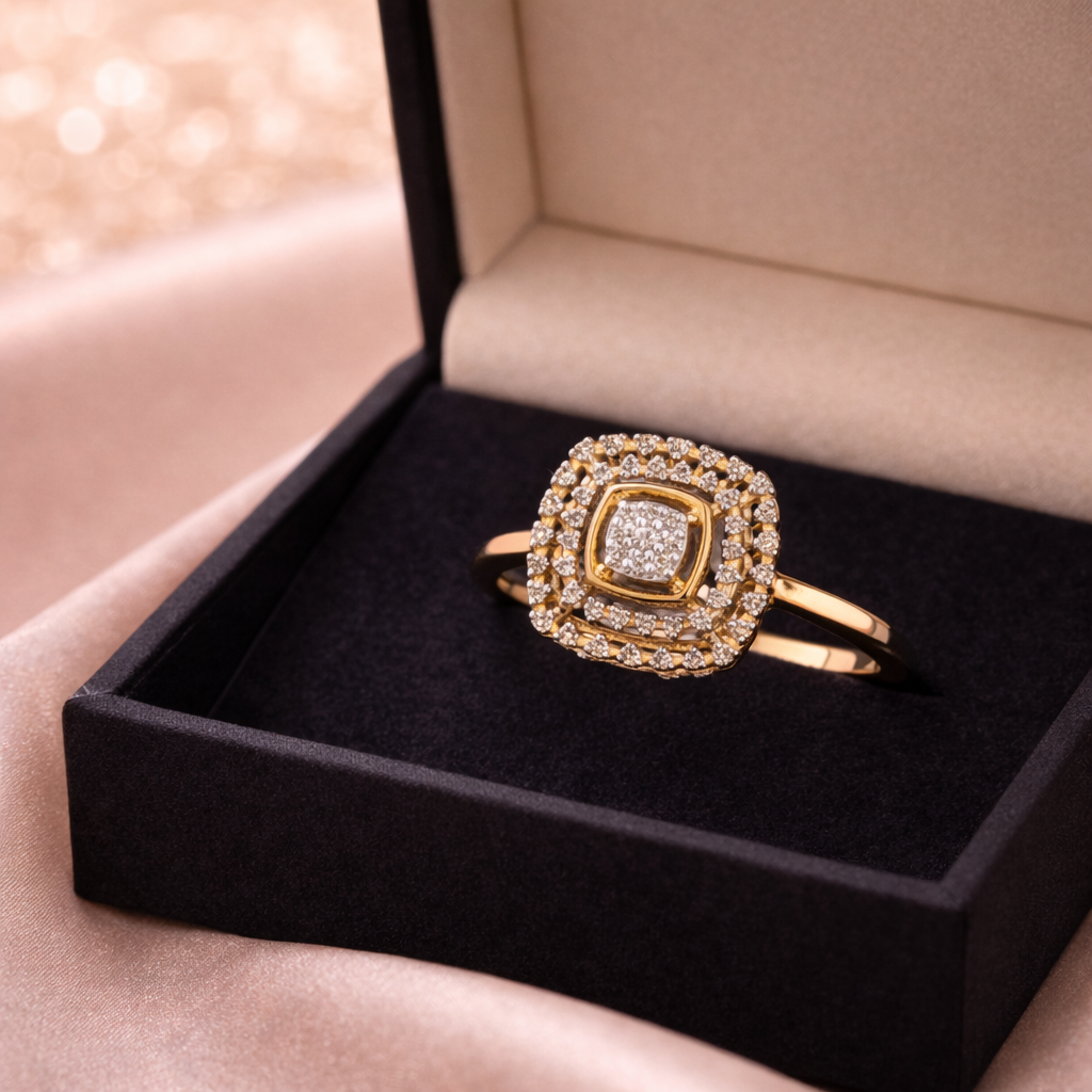 Elevate your everyday style with this exquisitely designed square diamond gold ring, crafted to reflect refined luxury and modern elegance. The ring features a stunning square-shaped centerpiece adorned with brilliant diamonds arranged in a flawless grid, framed by a delicately twisted gold border for added charm.